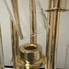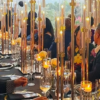 Crystal glass lampshades, handcrafted, cylinder cluster design, gold metal arm and base, chic sophistication, centerpiece, table decoration, indoor and outdoor decor, wedding gift, anniversary gift, housewarming gift, top-quality materials, durable, symmetrical design, crystal-clear lampshades, versatile.